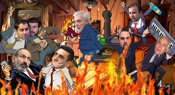 «Լավ, Անդո, հո չե՞նք սառելու, էն փեջի մեջ մի շիշ բենզին լցրու, շիշ բռնողը ո՞ւր ա»,- հարցնում է ինքը։ Շիշ բռնողն անմիջապես գրպանից մի շիշ բենզին է հանում ու տալիս Անդոյին, բայց սա դիմադրում է․ «բայց էս ի՞նչ միջանձնային հարաբերություններ են, ձեր մեջի միակ սպան ես եմ, ինչի՞ պիտի փեջը ես վառեմ»։ «Վառի, վառի»,- բարկանում է ինքը։ «Համ էլ՝ էս Գռզոյի բենզինն ա, դժվար էլ վառվի»,- ասում է շիշ բռնողը։ «Որ վառվես էլ՝ վնաս չկա»,- քթի տակ փնթփնթում է Պապիկյան Սուրոն։ «Ես էլ շուտվանից հրդեհի ֆոնին քարոզչական հոլովակ չեմ նկարել»,- ձեռքերն է շփում Ավինյան Տիկոն ու գրպանից հանում հեռախոսը․․․ Ճար չկա, Անդոն բենզինը լցնում է վառարանի մեջ, ու տեսնելով, որ բռնկվեց՝ այրվող շիշը շպրտում սեղանին։ Պապիկյան Սուրոն ու Վահագն Ալեքսանյանն անմիջապես նետվում են դեպի դուռը, բայց քանի որ չեն ուզում մեկը մյուսին զիջել՝ դռան մեջ լռվում են ու ոչ առաջ են կարողանում գնալ, ոչ ետ։ Խուճապը մեծանում է։ Դրսից մարդկանց ձայներ են լսվում։ Ալենը փորձում է օգնություն կանչել, բայց ինքը սաստում է․ «ձենըդ կտրի, արա՛, իմանան մենք ենք՝ մի էրկու վեդրո բենզին էլ իրենք կավելացնեն»։ Ապա դիմում է շիշ բռնողին․ «ի՞նչ ես կանգնել, զանգի հեղափոխության պահապաններին»։ «Բջջային կապ չկա, շե՛ֆ, մենակ ադրբեջանական սոտըվին ա բռնում»,- սփրթնում է շիշ բռնողը։ «Ադրբեջանականը բռնում ա՞»,- ուրախությունից ծղրտում է ինքը ու խլում հեռախոսը․ «ալո՛, ալո՛, Իլհամ Հեյդարովիչ, սենց մոմենտ ա, վիճելի տարածքում ենք․․․»։